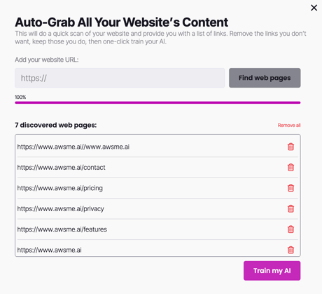 Training this agent is as simple as dropping a URL into the “Brain” of the tool. You can choose specific pages or use an entire website as training data.